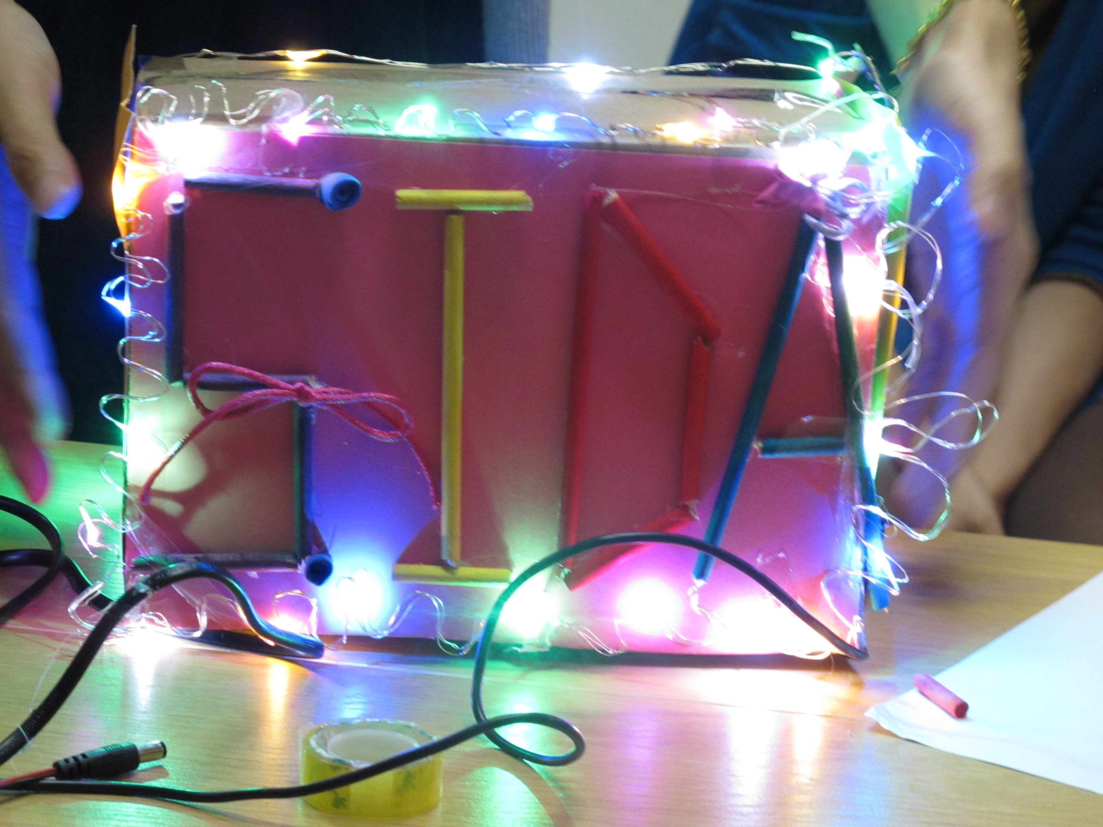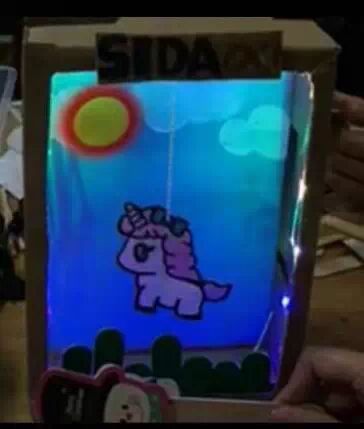 众所周知,SIDA是一个非盈利的社会团体组织,并在金牌义工协会执行副会长兼秘书长封昌红女士的带领下,我们小组选择用废弃的纸箱为山区孩子们制造玩具。以“橱窗”的概念展示,绘制了象征孩子天真纯洁的独角兽为主角,并绘制了蓝天和白云,预示着他们亦能翱翔蓝天。配置了能旋转的太阳,寓意为我们不断为大山孩子送温暖。触碰“lightsense"的装置,”橱窗“里的灯光以及太阳便会亮起来和旋转起来,预示着遮掉阴暗的地方,你的生活将充满色彩和阳光。鼓励孩子们永不放弃,在大山的他们并不孤单。