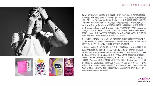 凯瑞姆·瑞席的众多获奖设计作品中包括民主设计作品,包括随处可见的Garbo垃圾桶以及他为Umbra设计的“oh chair”,室内设计作品中包括Morimoto餐厅、雅典的Philadelphia及Semiramis酒店。在此次开幕祝酒会中凯瑞姆·瑞席首发的新书是其20年来的设计作品集,或许能够在这本书中看到刚刚提及的设计作品的“身影”。