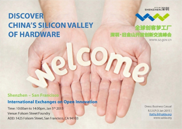 昨日,记者从深圳市工业设计行业协会了解到:2015年1月5日,深圳•旧金山开放创新交流峰会将在美国素有硅谷之称的加利福尼亚州旧金山市福尔逊铸造车间举行。这是深圳市政府第一次走出国门以官方身份来面向全球推介中国深圳-创客之城。