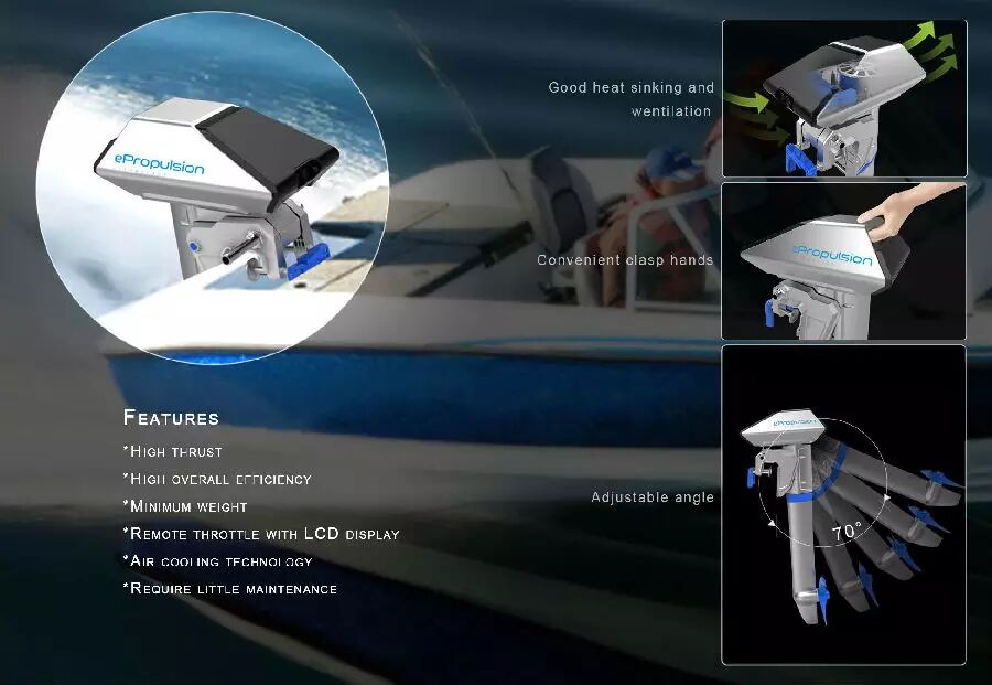 作品含义及独特性:这6KW电动舷外发动机针对产品的耐用,噪音和污染的提供了解决方案。其高效率和静音设计使其非常适合充气,钓鱼等小型船只。连同高能量密度的电池使用,它可以提供给你的船合理的持续时间和距离。