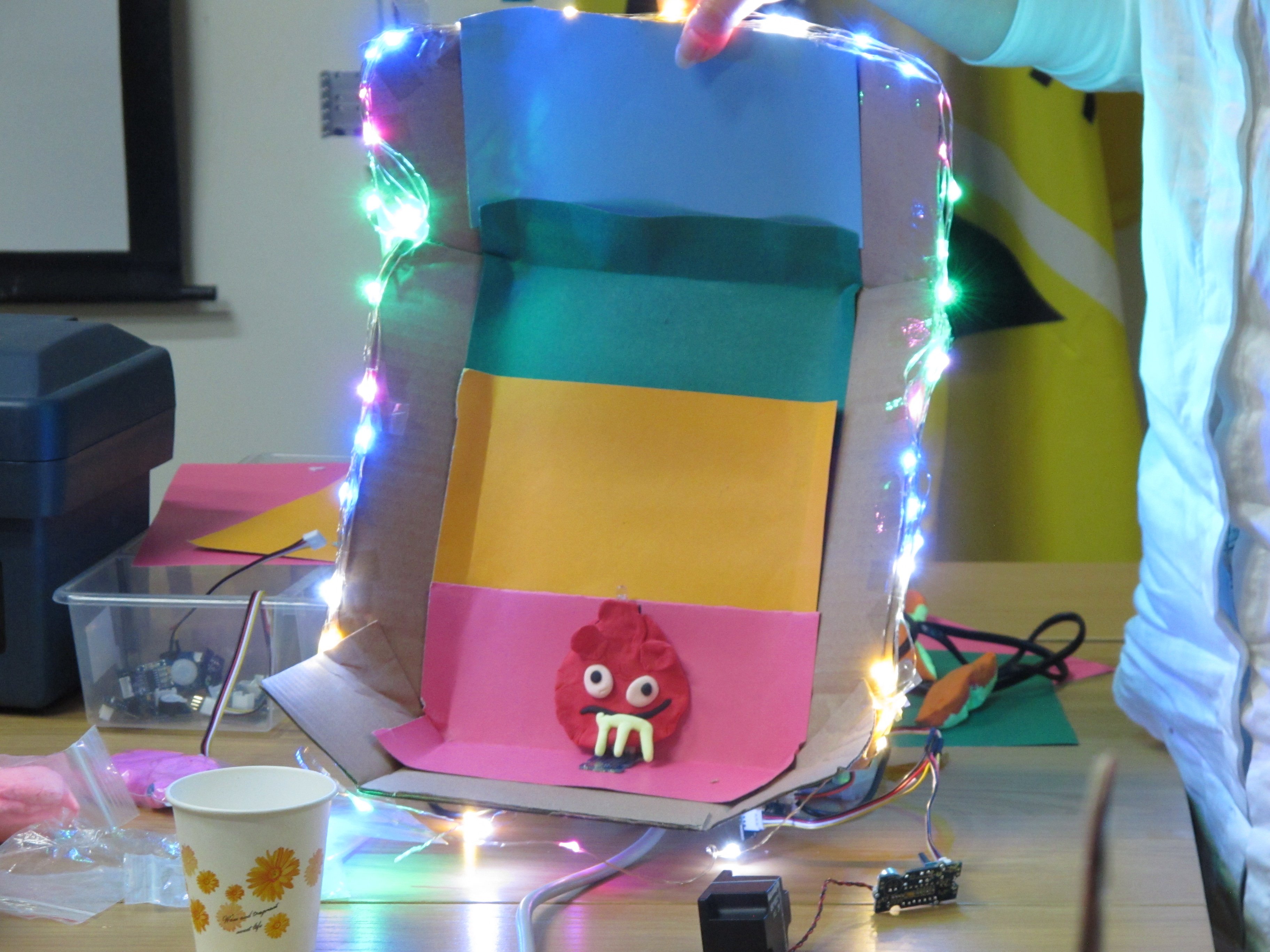 众所周知,SIDA是一个非盈利的社会团体组织,并在金牌义工协会执行副会长兼秘书长封昌红女士的带领下,我们小组选择用废弃的纸箱为山区孩子们制造玩具。以“橱窗”的概念展示,绘制了象征孩子天真纯洁的独角兽为主角,并绘制了蓝天和白云,预示着他们亦能翱翔蓝天。配置了能旋转的太阳,寓意为我们不断为大山孩子送温暖。触碰“lightsense"的装置,”橱窗“里的灯光以及太阳便会亮起来和旋转起来,预示着遮掉阴暗的地方,你的生活将充满色彩和阳光。鼓励孩子们永不放弃,在大山的他们并不孤单。