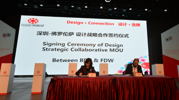 开幕式上,深圳市工业设计行业协会与意大利罗伦萨签署了设计战略合作协议,国家省市政府领导、商界精英等500多位嘉宾及设计界杰出代表和同仁们,见证了这一中国工业设计发展史上的历史时刻。两座世界设计名城,将就战略签约框架协议,加强双方的设计推广及提升设计产业的国际竞争力,强化双方的设计交流合作,并逐步落实双方在设计交流、设计推广、研究发展、人才培育及设计辅导、知识产权保护等项目的交流合作。打造双方设计、产业交流合作平台,定期透过双方互访、论坛、研讨会等形式,持续进行专业交流及人脉建构。