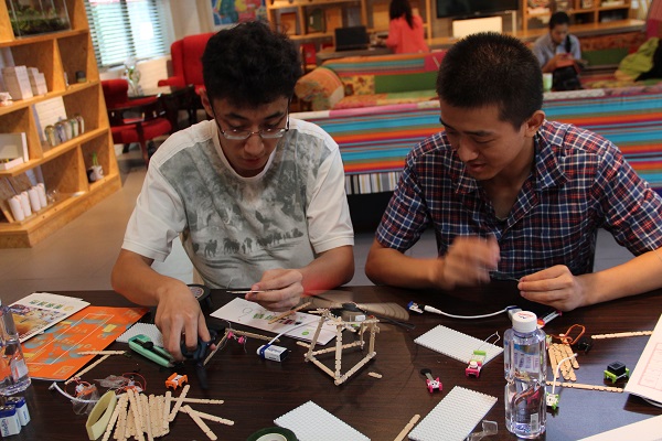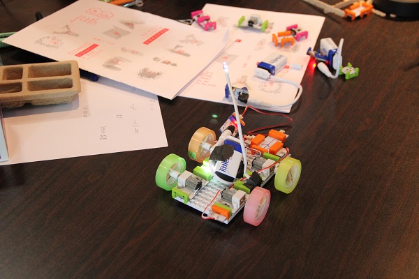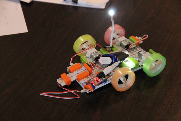 活动最后,主讲嘉宾王震杰先生在现场为参与活动的人员展示了他的创作功力,在十分钟之内,利用电池、电源开关、塑料底板、马达、胶圈、小木块、电路延伸器、连接器等制作出了一部会走动的小车,让现场的每一位人员都看得目瞪口呆。